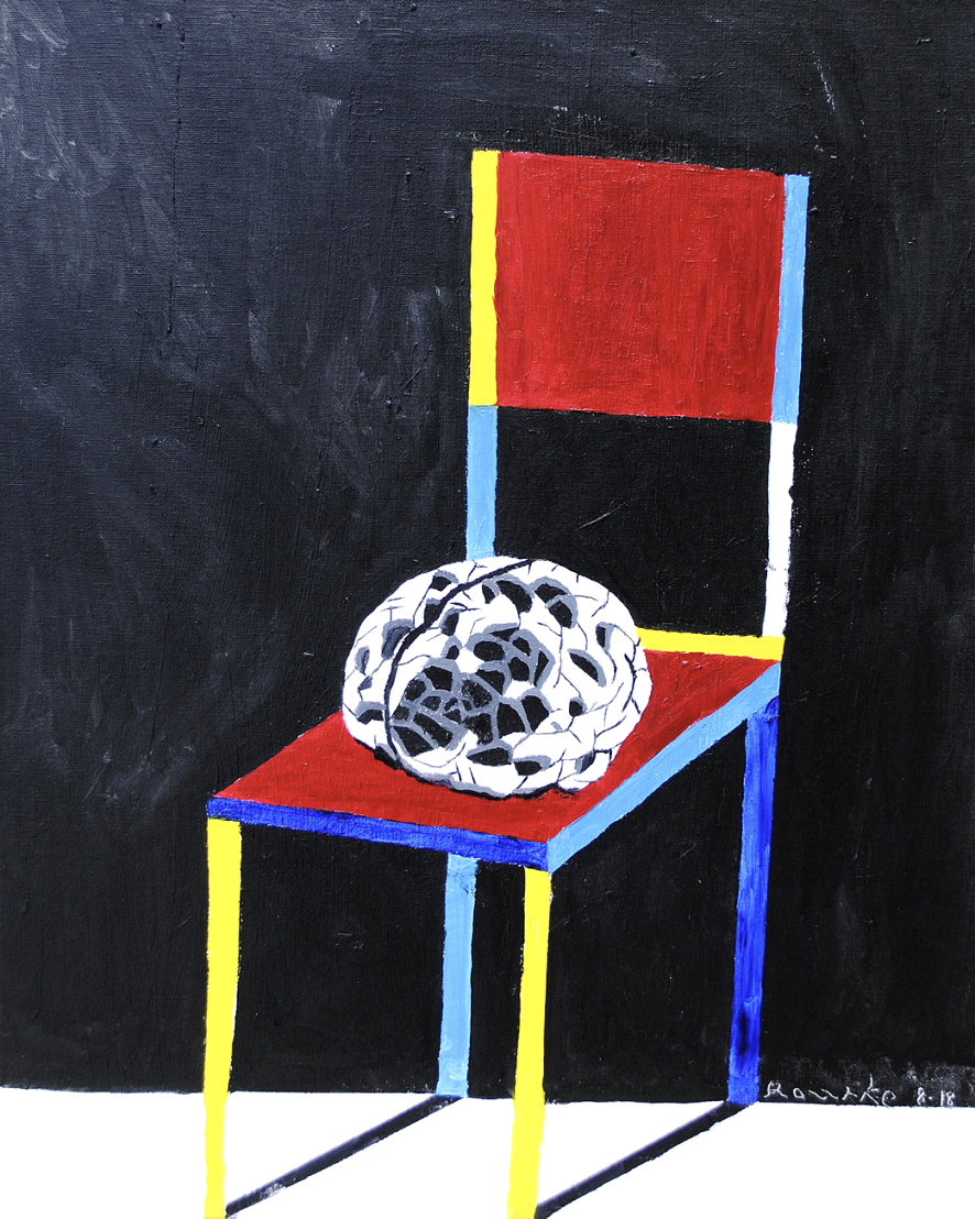 This painting shows a Deaf child’s brain on a school chair, where 3D puzzle pieces are missing. It means language deprivation. They are not getting full access to communication. This is why sign language is so important. Still today, some Deaf adults struggle with reading and writing, trying to express but communication is limited with frustrations and anger. Why is the school chair in the spotlight and the background black?