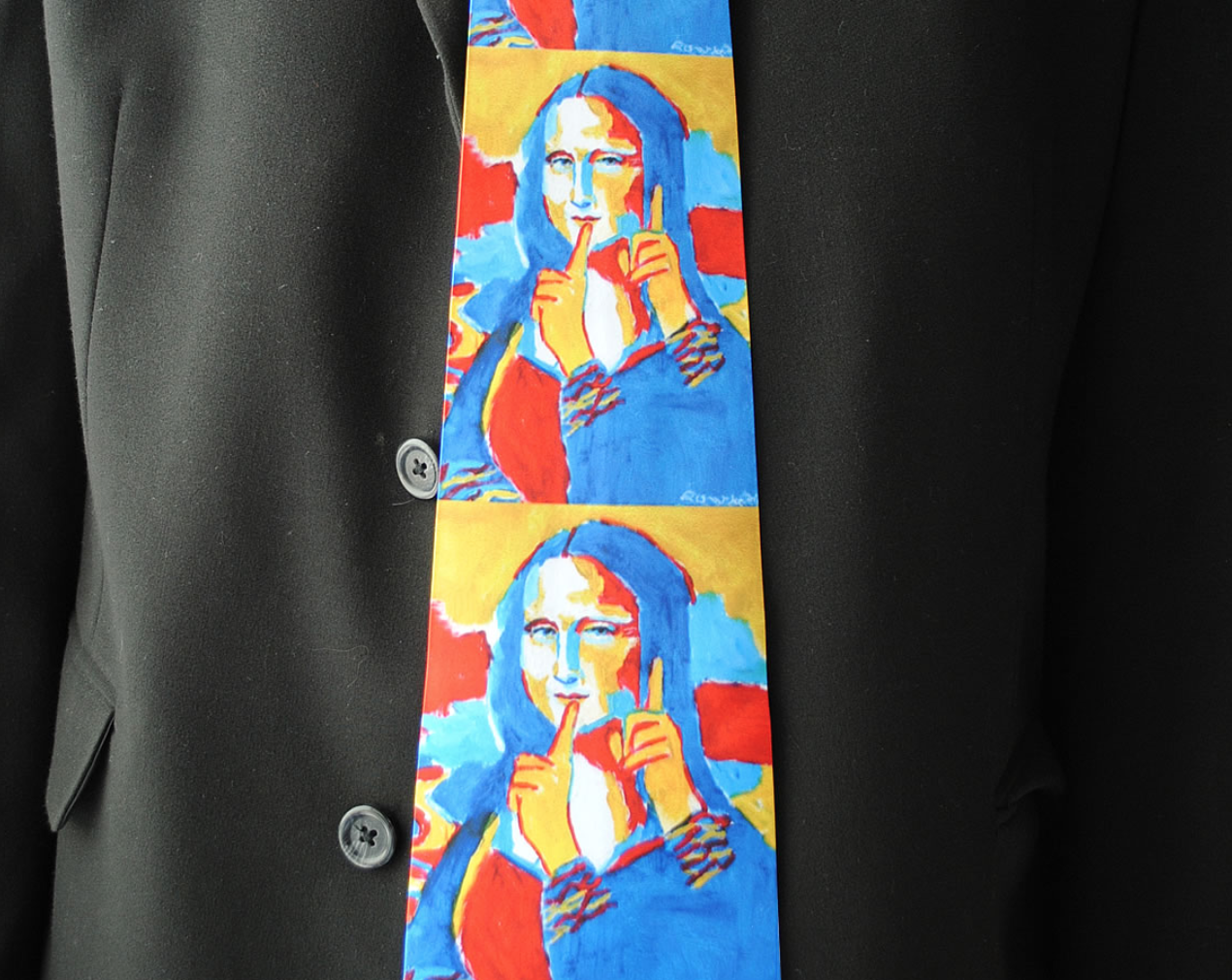 Painting prints on front and back of tie.
