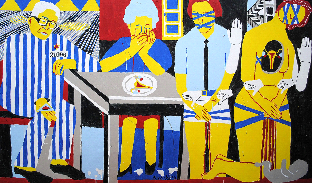 The man’s name is David Bloch. He was sent to Dachau concentration camp in Munich, Germany. When David first learned of the rise of Nazi Germany, he thought God would take care of everything. The Nazi came and took him to Dachau. He was given a number 21096. He saw everything happened at the camp and became dismayed to why God did not help? He made the eye of God, closed.