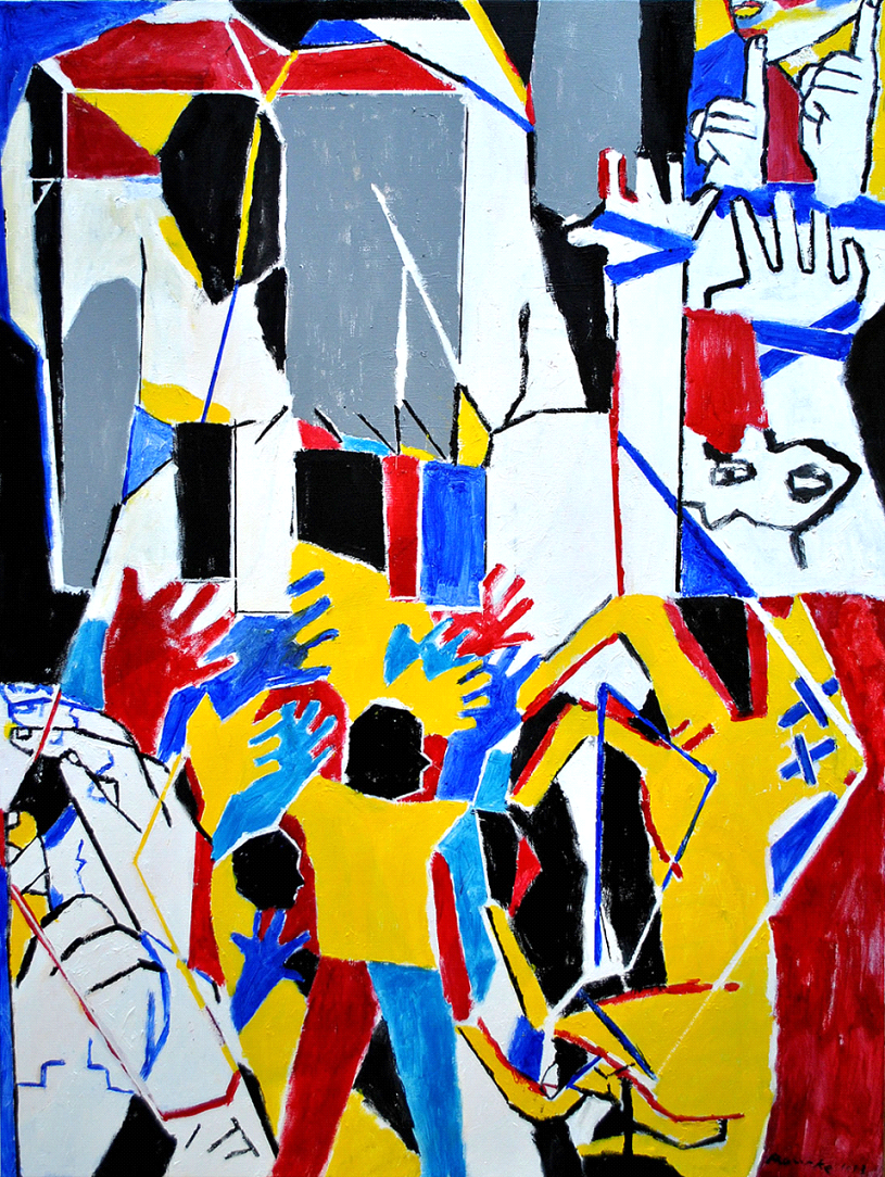 This painting is about Deaf View Image Art as in De’VIA. It shows three themes: resistance art, affirmative art and liberation art. These images represent Audism, Second Wave of Oralism, Paternalism, Submissive, Mask of Benevolence, Subaltern resistance and Empowerment. The artist had painted these images over the year, to show our Deaf human rights and the struggles that are seen repeatedly. This is what Deaf View Image Art is about in the painting. The hidden image in the painting shows the artist. And in fact, the painting itself is a self-portrait, the artist is looking at all the images, thinking about what can be done in the Deaf world.