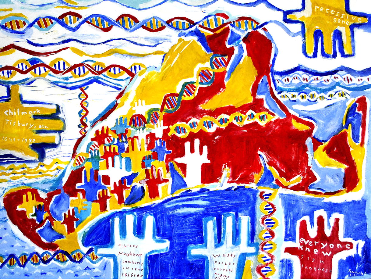 This painting The Deaf Vineyarders, is about the legacy of the deaf on Martha’s Vineyard in the mid 1600’s and finished in 1952. It shows DNA structures because deaf genes were among many families living on Martha’s Vineyard. Hands were shown in Chilmark, West Tisbury and other smaller towns where most deaf families lived and worked as farmers and fishermen. These names: Tiltons, Mayhews, Lamberts, Smith, Skiffes, Wests, Pooles, Cottles, Rogers and many others were among the deaf and hard of hearing families who lived on Martha’s Vineyard and became a community over the course of several generations. The island became known as the place where “everyone spoke sign language.” This painting is owned by the Istituto dei Sordi di Torino in Turin, Italy.