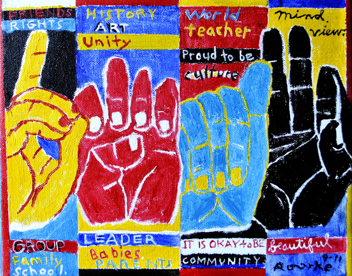 This painting is about the Deaf Culture and their way of life. The fingerspelling spells as D – E – A – F and the word comes to: Deaf Friends, Deaf History, Deaf World, Deaf Mind, Deaf Rights, Deaf Art, Deaf Teacher, Deaf View, Deaf Group, Deaf Unity, Proud to be Deaf, Deaf is Beautiful, Deaf Family, Deaf Leader, Deaf Culture, Deaf School, Deaf Babies, It is okay to be Deaf, Deaf Parents and Deaf Community