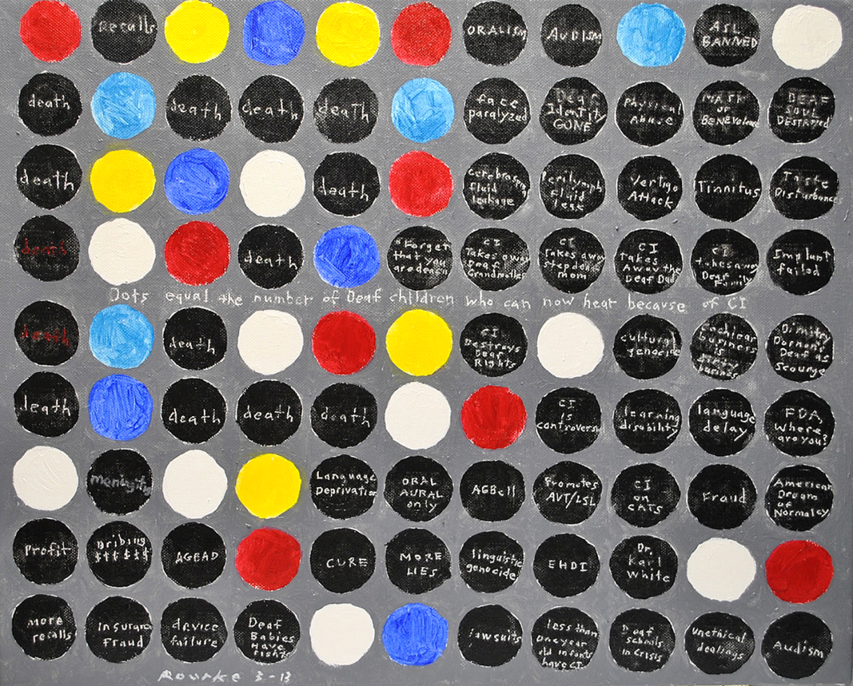 The white words on the center of the painting says, “Dots equal the number of Deaf children who can now hear because of CI.” The colored dots represent Deaf babies and children have cochlear implants. The black dots represent the true facts on what’s been happening behind CI businesses and how that affect the Deaf community. The black dots also refer to “black holes,” meaning they are deceived by, destroyed by, and so on. There is a hidden message in the painting.