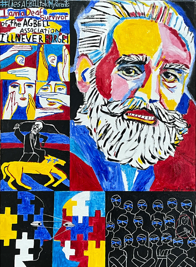 The painting was inspired by Katie Booth’s book The Invention of Miracles: Language, Power, and Alexander Graham Bell’s Quest to End Deafness and Karen Christie’s powerful review about Katie’s book. After reading the book and Karen’s review, I decided to paint. The painting focuses on many traumas that Deaf people have experienced in the past and in the present, is why the title is named for Generational Trauma. I picked out five paintings that I did in 2010 through 2013. The first top left painting is about #LiesAGBELLtoldmyparents Deaf survivors shared their stories. The second top left painting is about AUDISM. The third bottom left painting is “AGBELL Whips a Deaf Horse” and that is about how the system forces listening speech language repeatedly. The fourth bottom left painting is about language deprivation, and the fifth bottom right painting is about mask of benevolence. The painting of Alexander Graham Bell shows a fearfully expression because his biggest fear was failure. He was afraid he would fail something.