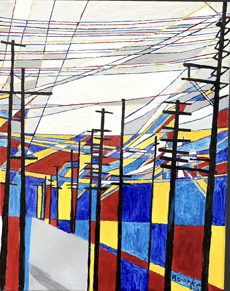 This painting shows the cluttered utility and telephone poles with many electrical and fiber optic cables that looks confusing. This is a concept where a Deaf person feels a lost identity, not knowing who the person is, or where to go, or which direction to follow, walks through complicated surroundings. The color shapes represent social media, social change and social justice that are placed in the cables and on the ground make life more confusing. Based on my artist in residencies, I have seen many Deaf youths wandering around, searching for their lost identity where they were coming from mainstreamed programs, or how they were raised or taught, have language deprivation.