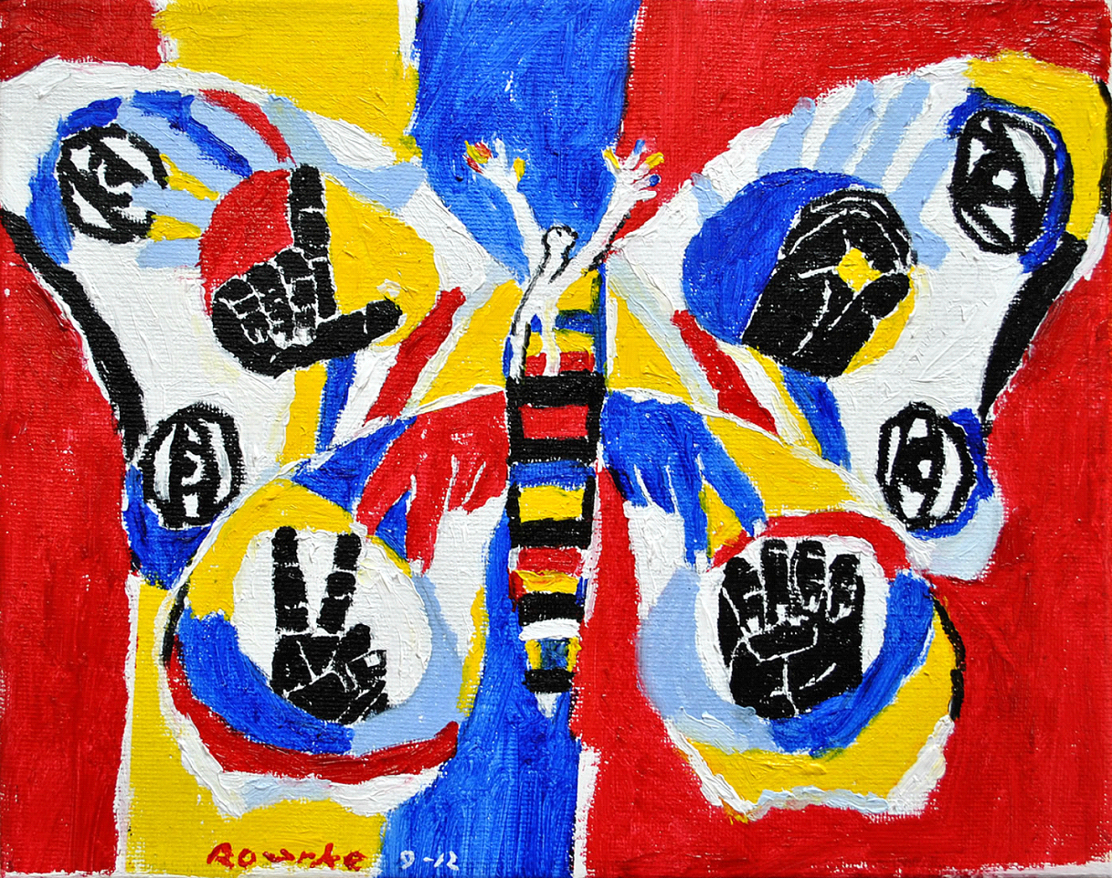 This painting is inspired by infamous ASL poet, Debbie Rennie, “Black Hole: Color ASL.” The ladder represents a direction or a path that leads you to a new journey. A Deafhood journey. A Deaf artist is at the top of the ladder, spattering red, yellow and blue paint on its wings and made this Deaf butterfly filled with LOVE. The butterfly has its own eyes and is standing strong with hands waving