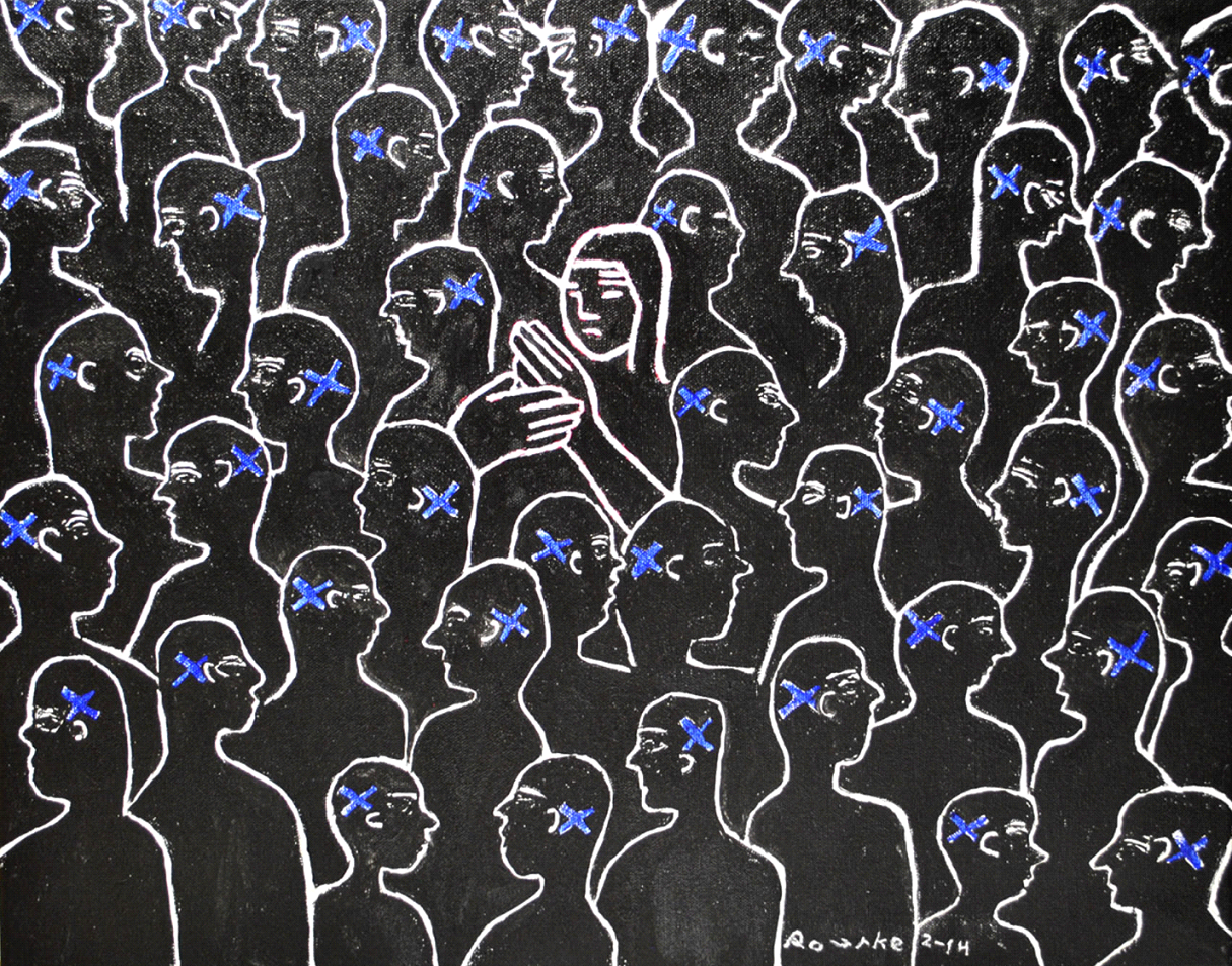 This painting is inspired by the book, Understanding Deafhood in Search of Deafhood by Paddy Ladd. This reminded me of the painting I did of ‘Mask of Benevolence.’ This time with cochlear implants on Deaf children, going into mainstreaming and genetic engineering. The Deaf person at the center, said, STOP