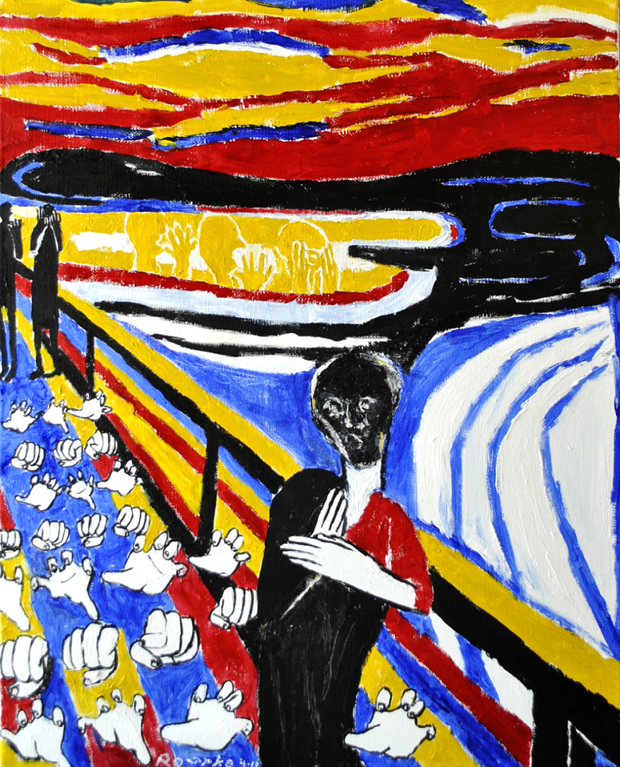 This painting is about Paternalism towards Deaf people. This is about how the system controls the Deaf people. The “Hearing Masters” take charge of the Deaf people and treat them as “Deaf Subjects”, according to Dr. Paddy Ladd’s book Understanding Deaf Culture: In Search of Deafhood, Chapter two, on page 103-104. This painting is inspired by Edvard Munch’s The Scream.