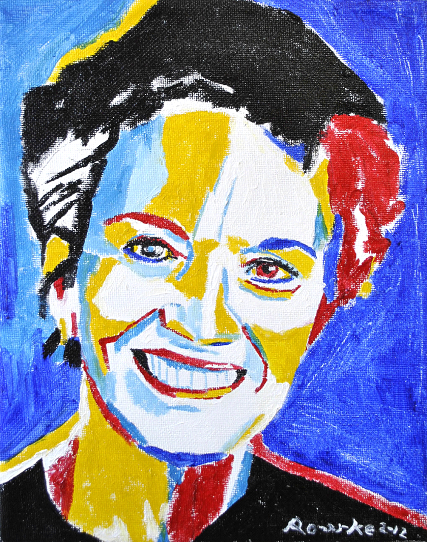 This painting is Phyllis Frelich. She was born on February 29, 1944, in Devils Lake, North Dakota. Her parents were Deaf and she was the oldest of nine Deaf children. She attended the North Dakota School for the Deaf and graduated in 1962.