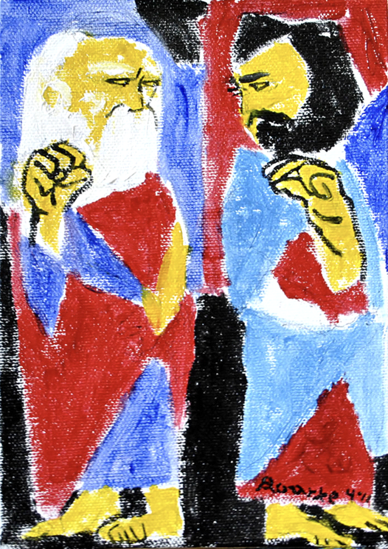 This painting is about Socrates vs. Aristotle, 360 B.C. Socrates quoted by Plato in “Cratylus” he said, “Deaf can express themselves in gestures movement.” Aristotle (384-322 BC) said “Deaf born senseless and incapable to reason.” Socrates signed “Yes, Deaf can” and Aristotle signs “No, Deaf cannot.”