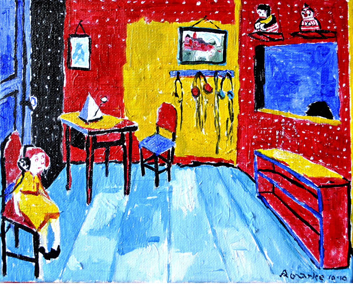 This painting is inspired by Vincent Van Gogh’s ‘The Bedroom at Arles, c.1887’ with the same table, chairs, picture frames and floor. The black silhouette at the blue window is the audiologist. The picture frame on the right side of the wall, is the Alexander Graham Bell’s estate and his sheep flock. The wirings and headphones are hung up against the wall. The picture frame on the left side is the Alexander Graham Bell’s favorite triangle shape. The white dots on the walls represent the sound-proof room. The clapping handed monkey and the red-lit nose clown bring back memories. The painting has a claustrophobic feel and its isolation and the cold room itself.