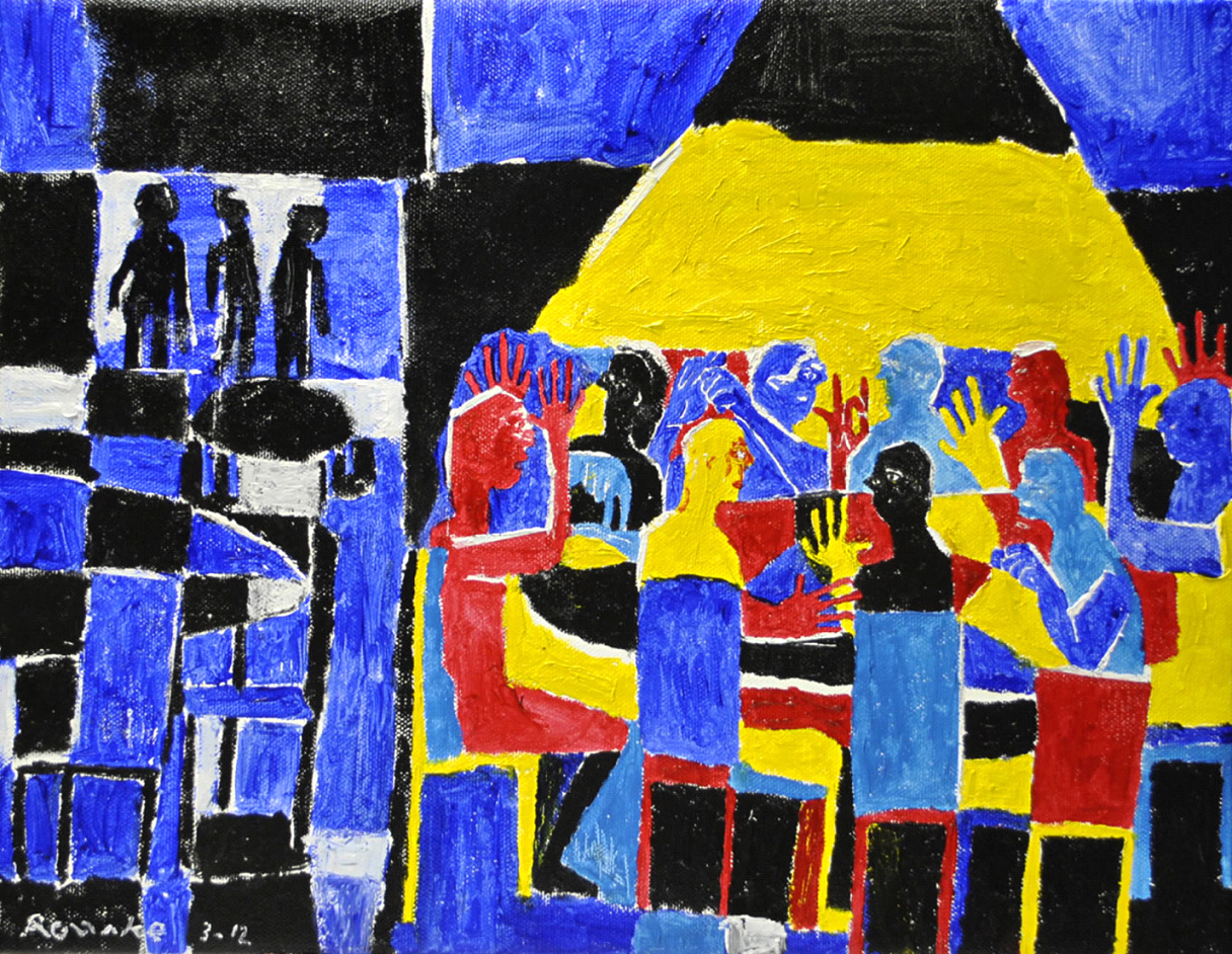 This painting is about the Deaf Culture. Deaf people gathered around the table, eating and drinking and talking. After meal was done, and table cleared out, they stayed and talked for hours. The restaurant closed and the waiters are standing behind waiting for them to leave. They were the last ones at the restaurant