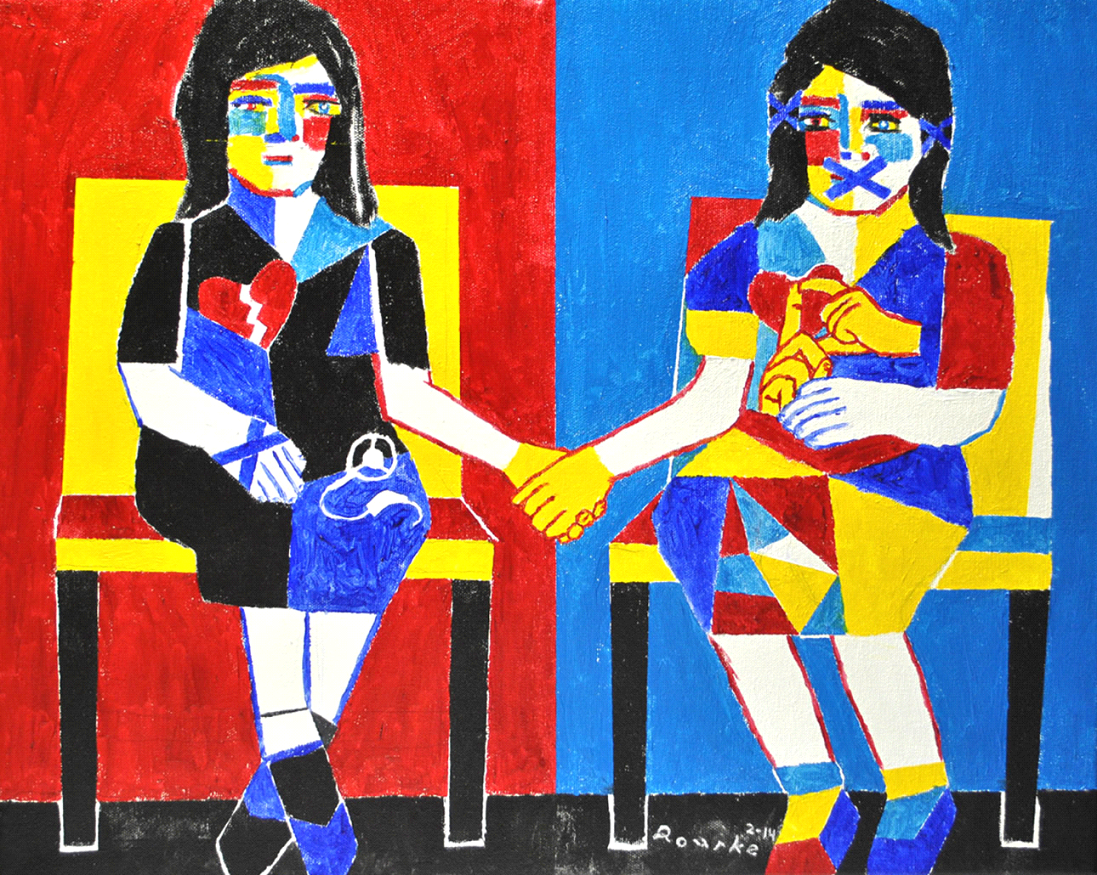 I am inspired by Frida Kahlo’s Two Fridas. This concept is based on one Deaf girl with two different identities. When her parents found out she was born deaf, she had her first cochlear implant at the age of 21 months. Her parents worked hard to teach her how to speak and listen and not to use sign language. They tell friends and relatives that their daughter is ‘hearing.’ When the deaf girl entered high school, this was where she was struggling to find her own identity. One side of her, shows a cochlear implant device on her lap. She took her device off, to show everyone what it looks like. She has blue tapes wrapped around her hand, to show that she was to keep her hands down and not to use sign language. Her dress shows AUDISM as in blue and black colors. This means that, a Deaf baby turned into a ‘hearing’ baby by wearing a cochlear implant and raised her as a deaf oral, shows a gross violation of human rights. On the other side of her, is her own Deaf human being, who knows her identity by heart, a big D letter on her heart, instead of a little d. Big D represents Culturally Deaf and little d represents a medical term for oral deaf. She has blue tapes on her mouth and ears, meaning power, she is Deaf and prefers to use sign language. The holding hand motif represents ’embracing each other’, knowing one is abusive and another is fighting and to maintain her own rights. Resistance category.